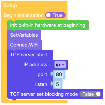 UIFlow2のsetupブロックでは、ブロッキングモード(blocking)をTrueまたはFalseに設定することができます。