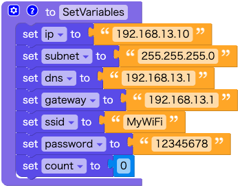 ネットワーク関連の変数 および、今回のテストアプリで使うカウント値用の変数 count に初期値を設定します。