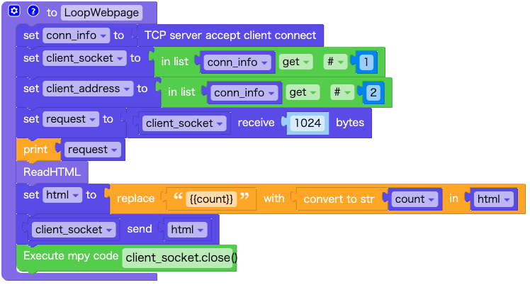 関数:LoopWebpage では、TCPクライアントからの接続を待ち受けて、HTMLを返します。