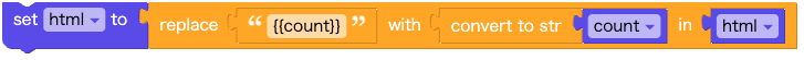 このブロックで、HTMLの中の{{count}} を 変数と置換することで、変数の値を表示します。