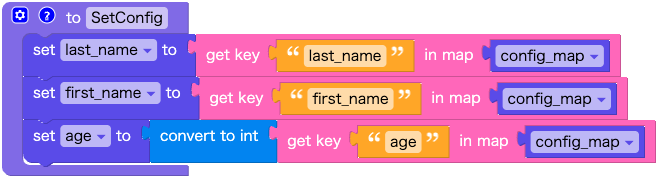 Map変数 config_mapから、変数 last_name、first_name、age に値を代入します。