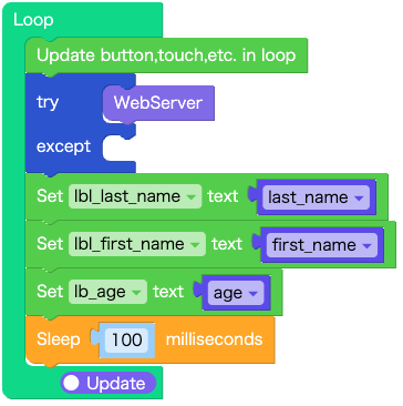 ブロッキングモードはFalse(ノンブロッキングモード)としたため、Tryの中で関数 Web Serverを実行します。