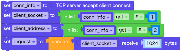 メッセージを受信すると、conn_info には、新しいソケットとクライアントアドレス情報のペア(client_socket , client_address)が入ります。