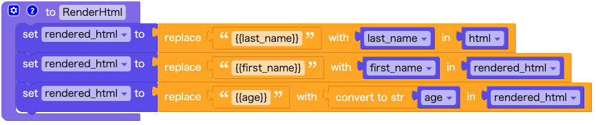 元になるHTMLの中の、{{last_name}}、{{first_name}}、{{age}} を、変数の値で置き換えます。