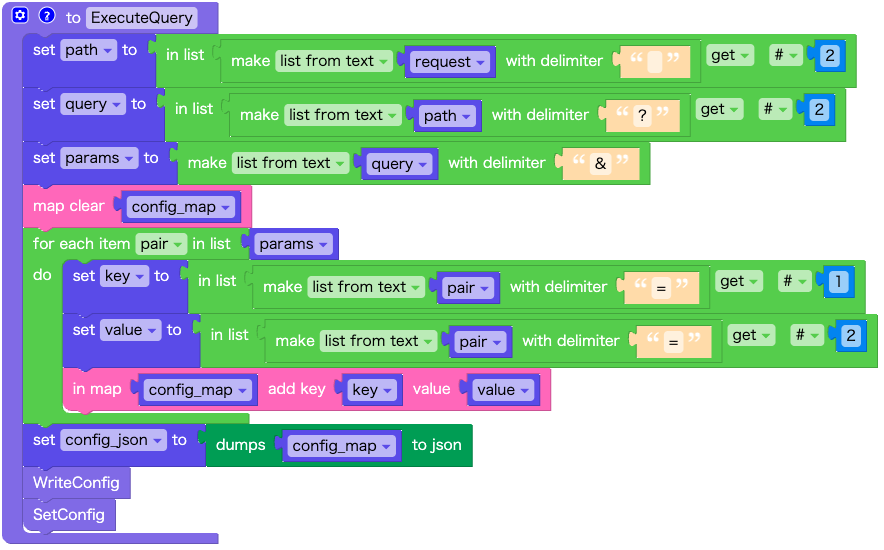関数 ExecuteQuery では、HTTPリクエストからクエリパラメータを解析して、設定情報として保存し、変数に保存する処理を行っています。
