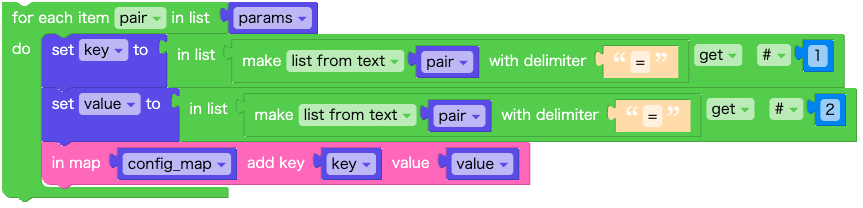 パラメータを key と value に分けて、マップに加えていきます。