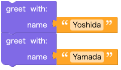 関数greetを実行すると"Hello Yoshida"と表示されます。