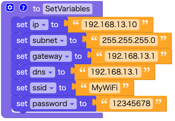 ip、subnet、gateway、dns、ssid、passwordなどプログラム内で使う変数の初期値を設定します。