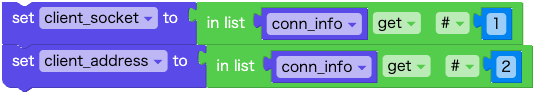 このブロックで、conn_info に格納された情報が 変数 client_socket および client_address に格納されます。